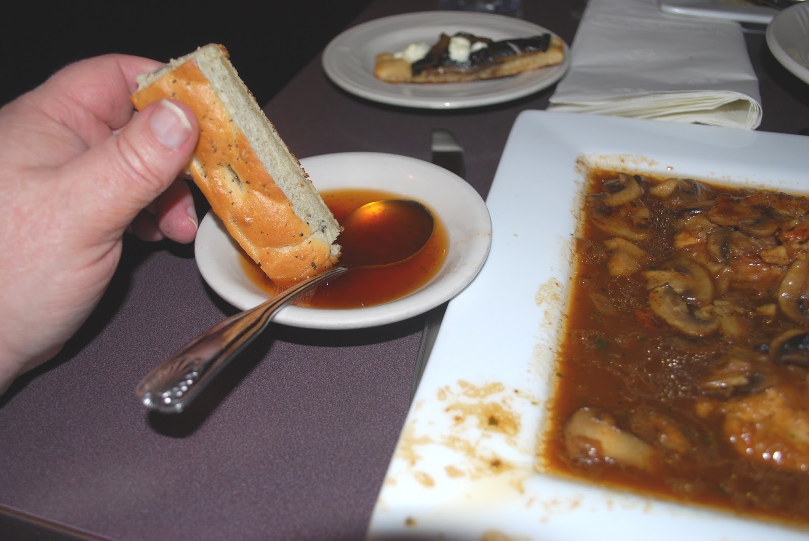 Debbie is trying to tip her plate so I can photograph her entree, but her sauce was trying to escape the shallow bowl. We're in an Italian restaurant, so, of course, she ordered veal. Debbie is like a broken record when it comes to Italian food.